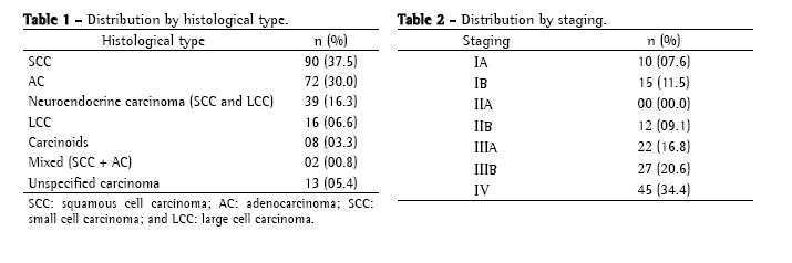 Concerning treatment, 52 patients (39.7%) received only chemotherapy, 32 (24.4%) were treated with chemotherapy combined with radiotherapy, and 47 (35.9%) were submitted to surgery alone or surgery accompanied by chemotherapy, with or without radiotherapy. Only 27 patients (20.6%) were submitted to surgery alone. Among those who received only chemotherapy, the most common histological type was adenocarcinoma, and, among those submitted to surgery alone, the principal histological type was squamous cell carcinoma. The initial stages (stages I and II) were found mainly among those submitted to surgical treatment alone. Those treated with chemotherapy, with or without radiotherapy, presented more advanced stages (stage IIIA, IIIB, or IV) at the time of diagnosis.