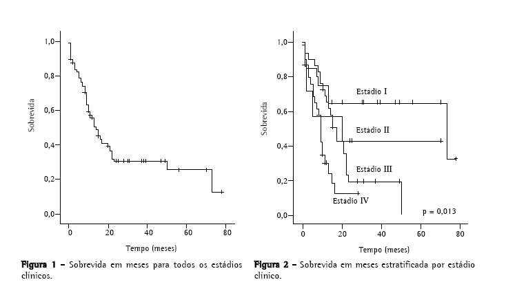 Dentre os 131 pacientes tratados, 45 (34,4%) apresentavam metástases no momento do diagnóstico, vários com múltiplos órgãos afetados. Os principais sítios de metástases foram, em ordem de freqüência: pulmões (23,6%), cérebro (16,0%), ossos (13,7%) e fígado (13,0%). A sobrevida em cinco anos foi de 25,0% (Figura 1) e, segundo o estádio, foi de 65,0% para o estádio I e 42,7% para o estádio II. Para os estádios III e IV, a sobrevida em dois anos foi, respectivamente, 19,4 e 11,8% (Figura 2). Os pacientes não tratados sobreviveram, em média, 4 meses após o diagnóstico.