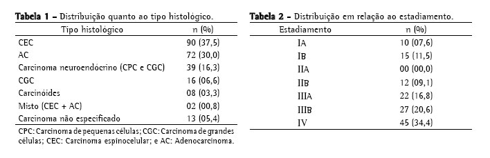 De janeiro de 2000 a janeiro de 2006, foram acompanhados 240 pacientes com câncer de pulmão, sendo 64% do sexo masculino. Estes foram seguidos até janeiro de 2007, quando foi encerrado este trabalho. Foram perdidos no acompanhamento 4,2% dos pacientes por não se conseguir contato telefônico. Entre os homens, a média de idade foi 64 anos e, entre as mulheres, 59 anos, e 77 (32%) estavam acima de 70 anos. O tabagismo foi evidenciado em 89,4% dos casos avaliados, com carga tabágica média de 47,02 anos-maço. Entre os homens, a prevalência de tabagismo foi de 97,36%, com carga tabágica média de 52,25 anos-maço. Entre as mulheres, os valores foram de 72,97% e 33,64 anos-maço. O padrão histológico de maior incidência foi o carcinoma espinocelular, seguido pelo adenocarcinoma (Tabela 1).