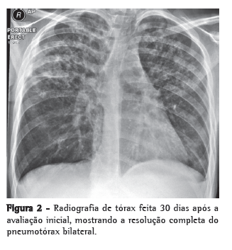Optou-se, então, por iniciar anticoagulação plena com warfarina e tratamento específico para hipertensão pulmonar com bosentano, antagonista não seletivo dos receptores de endotelina, na dose de 125 mg ao dia, por 4 semanas, aumentando-se para 250 mg ao dia a seguir. Após 6 meses de seguimento, a paciente apresentou melhora funcional significativa, evoluindo para classe funcional II, com SpO2 de 90% em ar ambiente e aumentando a distância percorrida no TC6 para 500 m.