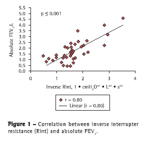 In our study sample, Rint was found to be slightly increased in comparison with local reference data.(3) In the present study, we analyzed the correlations between the main spirometric parameters and Rint. We also proposed a Rint cut-off point for evaluating bronchodilator response, comparing it with well-established data on the variation of FEV1. We found a significant correlation between Rint and absolute FEV1. In addition, the correlation between inverse Rint and FEV1 was found to be even stronger, which is probably due to the fact that both are flow-dependent. However, after the data were normalized, we found no significant correlation between the two, which suggests that Rint and FEV1 reflect different aspects of pulmonary function.