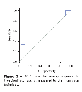 Our findings are similar to those reported in a study evaluating children and adolescents with CF.(17) In that study, moderate correlations were found between inverse Rint and FEV1, as well as between FVC and FEF25-75%. However, no bronchodilator response was found when the Rint technique was used.(17) In addition, data analysis in that study was different from that in the present study, in which a ROC curve was used and various cut-off points for bronchodilator response were evaluated, a Rint cut-off point of −28% having been found to be the best cut-off point to determine bronchodilator response. The accuracy of the method was reasonable, with a sensitivity of 66% and a specificity of 82%. However, spirometric values cannot be ignored, given that 34% of the results might be false negatives when bronchodilator response is evaluated by the Rint technique. A recent study reported that adult patients in whom spirometry revealed bronchodilator response also showed decreased Rint and decreased airway resistance by plethysmography, with no significant difference between the values.(22)