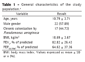 This was a cross-sectional study. Patients were eligible for inclusion in the study if they were aged 5-18 years and were being followed at the Cystic Fibrosis Outpatient Clinic of the Pontifícia Universidade Católica do Rio Grande do Sul (PUCRS, Pontifical Catholic University of Rio Grande do Sul) São Lucas Hospital, located in the city of Porto Alegre, Brazil. All of the CF diagnoses had been confirmed by sweat test results or by the finding of two CF gene mutations, as well as by the clinical evaluation performed by the attending team. Patients were recruited between March of 2008 and August of 2009. Patients with pulmonary exacerbations, those using antibiotics other than those used for maintenance therapy, and those who were unable to understand the test were excluded.