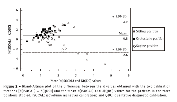 Normality of the data was evaluated by the Kolmogorov-Smirnov test, and the data are expressed as medians (nonparametric data) or as means and respective confidence intervals (parametric data). Repeated measures ANOVA was used for comparing the parameters evaluated, and the level of significance was set at 5% (p < 0.05). In order to evaluate the concordance between the two calibration methods, we used Bland-Altman plots (Figure 2). The statistical analyses were performed with the programs SigmaStat, version 9.1 (Systat Software Inc., San Jose, CA, USA), and MedCalc (MedCalc Software, Mariakerke, Belgium).