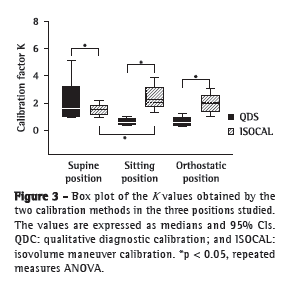 Calibrations were evaluated by a comparative analysis of the constant of proportionality (K). The values of the constant K are shown in Figure 3, which shows that, in the three positions evaluated, the values obtained with the QDC method were different from those obtained with the ISOCAL method. In the supine position, the K values obtained with QDC were significantly higher than were those obtained with ISOCAL (2.2 ± 1.6 vs. 1.50 ± 0.47; p < 0.05). In contrast, in the sitting and orthostatic positions, the K values obtained with QDC were significantly lower than were those obtained with ISOCAL (0.6 ± 0.3 vs. 2.4 ± 0.9 and 0.6 ± 0.3 vs. 1.9 ± 0.7; p < 0.05 for both). There were no differences between the K values obtained with QDC in the supine position and those obtained with ISOCAL in the orthostatic position.