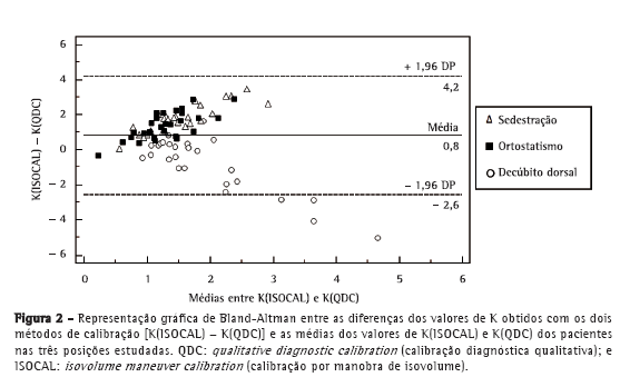 A normalidade dos dados foi avaliada pelo teste de Kolmogorov-Smirnov, e os dados foram expressos em medianas (dados não paramétricos) ou médias e respectivos intervalos de confiança (dados paramétricos). Para a comparação dos parâmetros avaliados, foi utilizada ANOVA para medidas repetidas, e o nível de significância foi ajustado para 5% (p < 0,05). A disposição gráfica de Bland-Altman foi utilizada para avaliar a concordância entre os dois métodos de calibração (Figura 2). Os programas SigmaStat, versão 9.1 (Systat Software Inc., San Jose, CA, EUA) e MedCalc (MedCalc Software, Mariakerke, Bélgica) foram empregados nas análises estatísticas.
