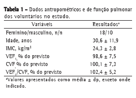 MétodosFoi avaliada uma amostra de conveniência composta por 28 voluntários adultos (18 mulheres e 10 homens) sem histórico prévio de doenças e com idades variando entre 18 e 65 anos. Os critérios de exclusão foram ser tabagista, ter diagnóstico de doenças respiratórias, ter dificuldade de compreensão para a realização das manobras respiratórias, apresentar deformidade da caixa torácica, ter doença osteomuscular que influenciasse a mecânica respiratória e apresentar alterações espirométricas. O comitê de ética em pesquisa da instituição aprovou o estudo (protocolo 1221/09), e todos os voluntários assinaram o termo de consentimento livre e esclarecido.