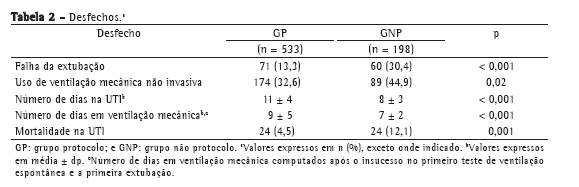 A taxa de falha de extubação no grupo não protocolo foi significativamente maior que no grupo protocolo (30,4% vs. 13,3%; p < 0,001; Tabela 2). As causas de reintubação foram obstrução das vias aéreas superiores após a extubação (em 4%), aspiração ou excesso de secreções (em 11%), encefalopatia (em 15%) e insuficiência respiratória (em 70%). O tempo de VM antes do teste de desmame (até o primeiro TVE malsucedido) foi semelhante nos grupos protocolo e não protocolo (5,0 ±1,4 dias vs. 5,2 ± 2,1 dias; p > 0,05). Entretanto, o número total de dias em VM (após o primeiro TVE malsucedido até a extubação) foi maior no grupo protocolo que no grupo não protocolo (9 ± 5 dias vs. 7 ± 2 dias; p < 0,001), assim como o tempo de permanência na UTI (11 ± 4 dias vs. 8 ± 3 dias; p < 0,001). A mortalidade foi maior no grupo não protocolo que no grupo protocolo (12,1% vs. 4,5%; p = 0,001). A Tabela 2 mostra os desfechos do estudo.