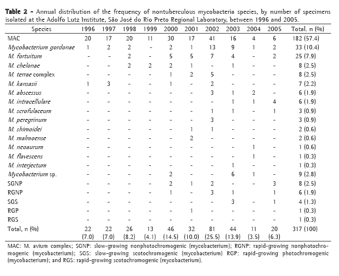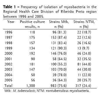 ResultsOver a 10-year period in the DRS-XV region, 1,300 cultures of mycobacteria were isolated from clinical specimens analyzed in the IAL-SJRP, of which 983 (75.6%) were identified as M. tuberculosis and 317 (24.4%) were identified as NTM (Table 1) The distribution of the 317 isolations of NTM, from 216 patients, was heterogeneous in this period, the index being highest in 2002-81 strains (44.8%)-and lowest in 1999-13 strains (9.7%).