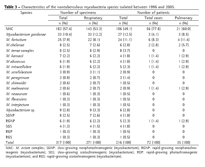 Objective: To study the incidence of nontuberculous mycobacteria and the range of species isolated between 1996 and 2005 at a regional branch of the Adolfo Lutz Institute-located in the city of São José do Rio Preto, Brazil-and to show the importance of laboratory testing. Methods: Mycobacteria were isolated from pulmonary and extrapulmonary specimens and identified through phenotyping and molecular methods (polymerase chain reaction-restriction enzyme analysis). Results: We isolated 317 nontuberculous mycobacterium strains: Mycobacterium avium complex, 182 (57.4%); M. gordonae, 33 (10.4%); M. fortuitum, 25 (7.9%); M. chelonae, 8 (2.5%); M. terrae complex, 8 (2.5%); M. kansasii, 7 (2.2%); and less frequent species, 54 (17%). During this period, 72 cases (33.3%) were characterized as mycobacteriosis, according to bacteriological criteria established by the American Thoracic Society in 2007. Of those 72 cases, 56 were attributed to M. avium complex. Of those 56, 29 (51.8%) were characterized as disseminated disease. Six cases were attributed to M. fortuitum, 3 to M. gordonae, 2 to M. chelonae, 1 to M. abscessus, 1 to M. kansasii, 1 to M. intracellulare, 1 to M. malmoense and 1 to Mycobacterium ssp. Conclusions: These results show the importance of the bacteriological diagnosis, since identification of the species enables early and appropriate treatment.