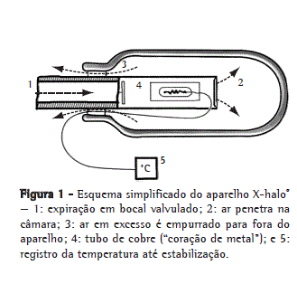 O aparelho utilizado para determinar a temperatura do ar exalado consiste em um coletor de ar exalado portátil, semelhante a uma garrafa térmica, no qual o paciente expira repetidamente, por meio de um bocal valvulado, por 5-10 min, até a estabilização da temperatura medida por um termômetro digital. A cada nova expiração, o ar que está coletado no compartimento é forçado a sair, sendo substituído, com a elevação gradativa da temperatura do tubo central de metal.