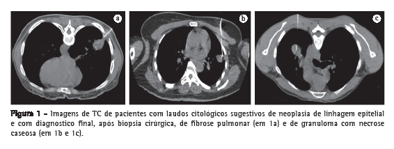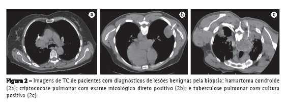 Dos 17 com diagnóstico confirmado de lesões benignas, 3 (17,6%) apresentaram resultados de análise citológica sugestivos de neoplasia. Os casos foram levados à cirurgia, sendo que 1 paciente recebeu o diagnóstico de fibrose pulmonar e 2 de granuloma por tuberculose (Figura 1).