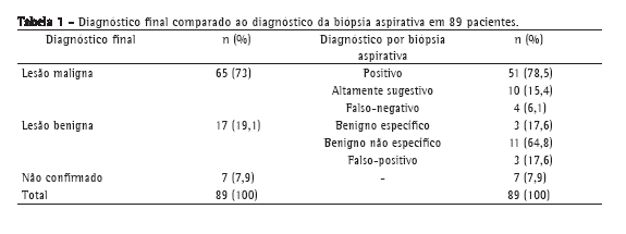 A confirmação citológica ou histológica de neoplasia maligna é definitiva. Entretanto, estabelecer o diagnóstico definitivo de uma lesão benigna traz inúmeras dificuldades. O achado de células inflamatórias não é suficiente para confirmar um diagnóstico de benignidade, nem para excluir malignidade. O diagnóstico de doença benigna deve ser específico para excluir neoplasia.(7,8) Por esse motivo, nos casos de laudos citológicos sugestivos de benignidade, mas não específicos, a investigação prosseguiu com biópsia cirúrgica ou acompanhamento clínico e radiológico. Um diagnóstico benigno específico contribui muito na investigação, evitando uma possível cirurgia ou o acompanhamento de longo prazo nos pacientes com risco cirúrgico elevado. Com exceção de lesões específicas, como hamartomas ou infecções, o diagnóstico específico somente por análise citológica de punções com agulha fina tem baixo rendimento, variando de 12-68%.(7,9,10) No presente estudo, esse diagnóstico ocorreu em 17,6% dos casos comprovadamente benignos, tendo 1 paciente o diagnóstico final de hamartoma e 2 de infecção localizada, resultados compatíveis com a literatura.(7) Por outro lado, pela análise histopatológica proveniente de biópsia com agulhas cortantes de maior calibre, esse índice varia de 52-91%.(10,11) Estudos sugerem um aumento de até 63% no número de diagnósticos finais especificamente para lesões benignas a partir de análise citológica e histopatológica concomitantes.(9,10,12)