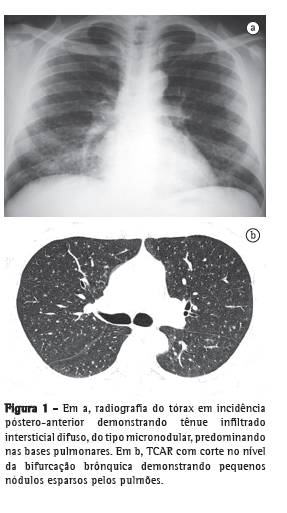 As manifestações pulmonares iniciaram-se em dezembro de 2008, com febre, tosse e episódios intermitentes de hemoptise de pequena monta. Recebeu tratamento antibiótico com amoxicilina (500 mg a cada 8 h por 7 dias), apresentando melhora da febre e da hemoptise, mas manteve a tosse seca. Negava outros sintomas, como emagrecimento, sudorese noturna ou piora do estado geral. Foi encaminhado para o setor de pneumologia para investigação. O exame físico não demonstrou alterações significativas. A radiografia de tórax revelou a presença de tênue infiltrado micronodular difuso (Figura 1a), melhor caracterizado pela TCAR de tórax (Figura 1b).