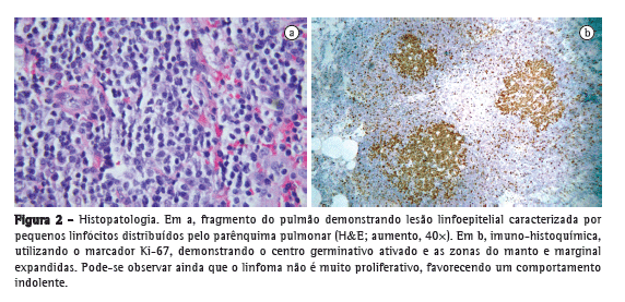 As principais hipóteses aventadas foram tuberculose miliar ou histoplasmose. A prova tuberculínica foi não reatora, a pesquisa de BAAR no escarro induzido foi negativa, e a sorologia para histoplasma foi não reagente. Foi solicitada, então, broncoscopia para a coleta de lavado broncoalveolar e realização de biópsia transbrônquica. A broncoscopia foi normal, e a pesquisa de BAAR, citologia e exame direto para fungos do lavado broncoalveolar foram negativos. A biópsia transbrônquica sugeriu o diagnóstico de doença linfoproliferativa, mas não foi possível definir o diagnóstico. O paciente foi, então, submetido à biópsia pulmonar por toracotomia. O laudo histopatológico revelou a presença de linfoma MALT pulmonar, confirmado a seguir por imuno-histoquímica (Figura 2). Após a confirmação diagnóstica, o paciente foi encaminhado ao serviço de hematologia. A conduta terapêutica adotada foi a observação clínica, pois tratava-se de doença indolente e o paciente estava clinicamente estável.