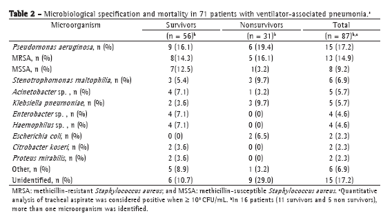 Microbiological specification by tracheal aspirate culture revealed the most common microorganisms, in survivors and nonsurvivors, to be Pseudomonas aeruginosa, Staphylococcus aureus (methicillin-resistant and methicillin-susceptible), Stenotrophomonas maltophilia, Acinetobacter sp., Klebsiella pneumoniae, and Enterobacter sp. In 16 patients (11 survivors and 5 nonsurvivors), more than one microorganism was identified (Table 2).