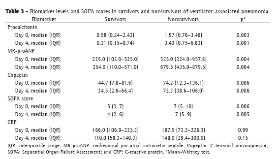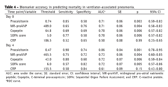 Our findings for D0 indicate the severity of the disease before the initiation of antibiotic therapy. Patients with biomarker values above the threshold for mortality on D0 were at a higher risk for mortality before antimicrobial treatment for VAP. However, our findings for D4 show the intensity of biomarker expression after 4 days of treatment. Patients with biomarker values above the threshold for mortality on D4 should receive special attention and should be reassessed. We found that the levels of procalcitonin, MR-proANP, and copeptin differentiated between survivors and nonsurvivors at both of the time points evaluated, as did the SOFA score. Although CRP has been described as a useful parameter to support the diagnosis of infection(29) and as an indicator of sepsis resolution,(30) absolute CRP values did not differentiate between survivors and nonsurvivors at either of the time points evaluated in our study (p = 0.99 and p = 0.15, respectively).