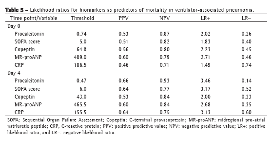 The aim of this study was to compare the predictive value of the levels of the biomarkers procalcitonin, CRP, copeptin, and MR-proANP, as well as that of the SOFA score, for mortality in patients with VAP. Although some of the data presented in this study have been published in previous studies,(7-9) those studies did not compare the predictors of mortality in terms of their accuracy.