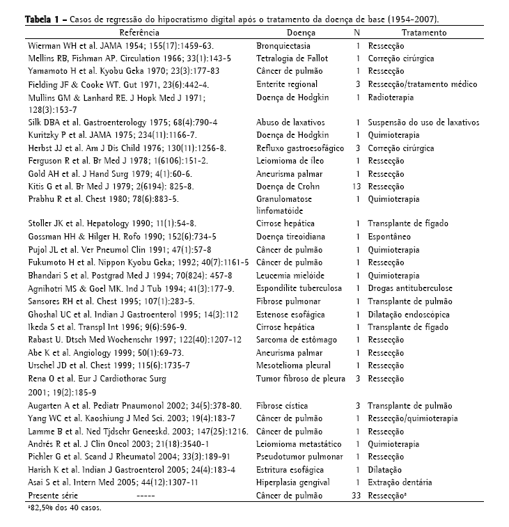 Objetivo: Estudar, por meio de avaliações objetivas, a ocorrência de regressão do hipocratismo digital (HD) em pacientes com câncer de pulmão, tratados cirurgicamente, e revisar a literatura sobre o assunto. Métodos: Sessenta e um pacientes com câncer de pulmão não-pequenas células-40 com e 21 sem HD-foram tratados por cirurgia de ressecção pulmonar. Onze deles (18%) também receberam radioterapia pós-operatória. No período pré-operatório e no 7º, no 18º e no 90º dia pós-operatório, o ângulo hiponiquial (AH) e a relação entre as espessuras falangeana distal e interfalangeana (EFD/EIF) foram determinados sobre imagens da sombra dos dedos indicadores em perfil. Uma revisão da literatura sobre regressão do HD (1954-2007) também foi efetuada. Resultados: Do período pré-operatório ao 90º dia pós-operatório, o AH diminuiu de 200,5 ± 5,0° para 193,3 ± 6,8° (p < 0,001), e a relação EFD/EIF, de 1,014 ± 0,051 mm para 0,956 ± 0,045 mm (p < 0,001) no grupo de 40 pacientes com HD. Em 33 (82,5%), o AH e a relação EFD/EIF diminuíram, mas, em 7 (1,7%), 6 com evolução desfavorável, esses valores não se reduziram. Nos 21 pacientes sem HD, tanto o AH (184,5 ± 5,5°) como a relação EFD/EIF (0,937 ± 0,046 mm) permaneceram inalterados após a cirurgia. Na literatura (1954-2007) foram encontrados 52 casos em que a regressão do HD, observada em diversas condições clínicas, foi explicitamente referida, 5 dos quais eram casos de câncer de pulmão. Conclusões: O HD em pacientes com câncer de pulmão regride na maioria dos casos após tratamento cirúrgico efetivo do tumor, o que pode também ocorrer em pacientes com outras condições.