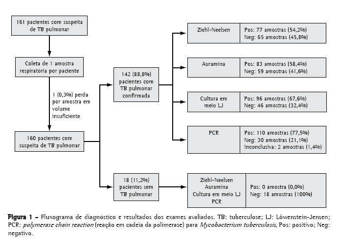 A cultura em meio LJ, que permite o diagnóstico de certeza da TB pulmonar, apresentou, no presente estudo, uma sensibilidade de 67,6%, inferior ao índice entre 80% e 100% habitualmente descrito,(19) devendo-se considerar a influência da coleta de uma única amostra. Outros meios de cultura e métodos de detecção automatizados ou semi-automatizados trazem como principal vantagem a redução no tempo de detecção da micobactéria (de 3 a 8 semanas para cerca de 15 dias). Contudo, o meio LJ, aprovado pela Organização Mundial de Saúde, permanece como o mais utilizado no Brasil, com o adicional benefício do armazenamento da cepa para estudos posteriores, além do fato de que algumas cepas crescem apenas neste meio. Por estas razões, o emprego de novos métodos não prescinde da realização da cultura convencional.(8)