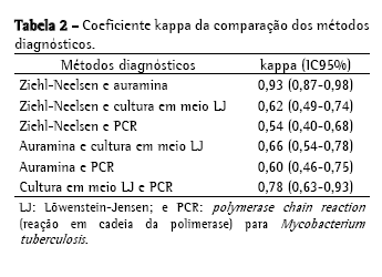 Os resultados obtidos com os métodos laboratoriais avaliados encontram-se na Figura 1. As pesquisas diretas pelas técnicas de Ziehl-Neelsen e auramina, a cultura e a PCR apresentaram sensibilidade de 54,2%, 58,4%, 67,6% e 77,5%, respectivamente. Em todos os métodos, a especificidade foi de 100%. O coeficiente kappa das comparações dos métodos empregados encontra-se descrito na Tabela 2.
