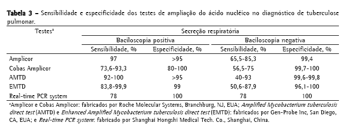 Devido ao pequeno número de pacientes sem TB pulmonar e ausência de infecção por outros patógenos, este estudo não é adequado para a avaliação da especificidade, apesar de não se ter observado nenhum resultado falso-positivo, e outros estudos confirmarem a elevada especificidade dos testes de amplificação do ácido nucléico (Tabela 3).(8,30)