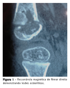Paciente do sexo feminino com dois anos e quatro meses de idade, proveniente da cidade de São Paulo (SP). Foi vacinada na maternidade com BCG e referia dor na perna direita, com deambulação prejudicada, há 15 dias; foi medicada com anti-inflamatório não hormonal, apresentando melhora, mas com piora duas semanas após a interrupção da medicação. A radiografia do joelho revelou lesão osteolítica na epífise distal do fêmur direito. A ressonância magnética (Figura 1) detectou lesão em epífise distal do fêmur direito, centromedial, com múltiplas áreas de erosão das corticais; havia maior descontinuidade da cortical; ausência de derrame na porção posteroinferior do côndilo femoral medial. Foi medicada por 14 dias com ceftriaxona, sem melhora. A punção biópsia do joelho direito revelou granuloma, sem evidenciação de BAAR. Foi iniciado o tratamento com isoniazida, rifampicina e pirazinamida. A investigação dos pais, irmãos e babás não revelou tuberculose pulmonar ou extrapulmonar. Na admissão ao nosso serviço, alguns dias após o início do tratamento, a paciente apresentava bom estado geral; a única anormalidade no exame físico era edema frio e doloroso à palpação no joelho direito, na porção distal e proximal à tíbia, com incapacidade funcional.