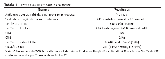 Os seguintes exames foram realizados: teste tuberculínico, com PPD de 14 mm de enduração; radiografia e ressonância magnética do joelho direito; enzyme-linked immunospot (ELISPOT) negativo; biópsia do joelho, apresentando escasso tecido ósseo com dois granulomas epitelioides, com necrose caseosa em um deles, e infiltrado crônico linfoplasmocitário; BAAR ausente; cultura positiva para micobactérias; PCR demonstrando a sequência de inserção 6110, que é característica de micobactéria, e presença de duplicação do espaçador 33 da região DR (amplicon, 172 bp), presente apenas na cepa BCG do Mycobacterium bovis e ausente no M. tuberculosis; PCR negativa para M. tuberculosis; exames de rotina (hemograma, VHS, HIV e avaliação hepática e renal) sem anormalidades; imunidade humoral e celular normal (Tabela 1); e TC de tórax normal.