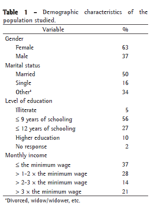 ResultsOf the 387 smokers investigated, 30% were from the city of Botucatu, 48% were from nearby cities and 22% were from other cities in the state of São Paulo. Mean age was 50 ± 25 years (age bracket: 19-74 years). The demographic characteristics of the studied population are shown in Table 1. Most patients were female (63%), married (50%) and had only eight or fewer years of schooling (61%). In addition, more than half of the subjects had a monthly income of less than two times the national minimum wage.