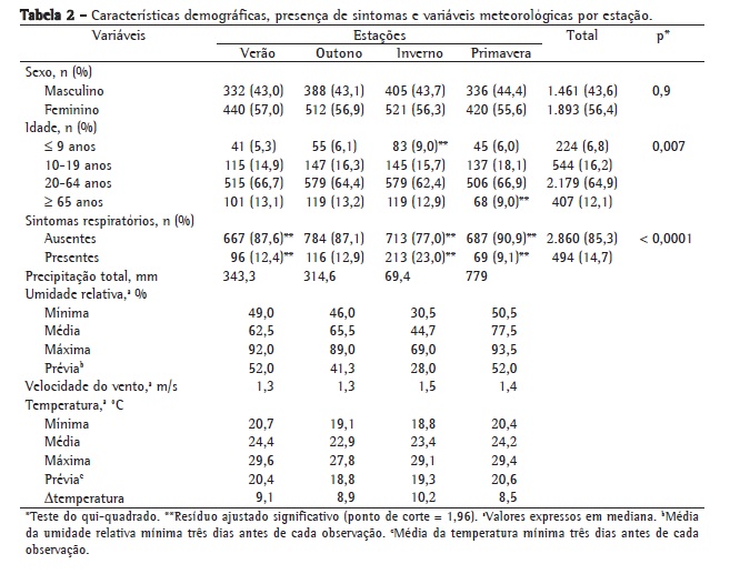 Como a interação entre o clima e a saúde é específica em relação à localização geográfica,(10) o objetivo do presente estudo foi avaliar o efeito da sazonalidade climática na ocorrência de sintomas respiratórios em indivíduos que procuraram uma Unidade Básica de Saúde (UBS) em uma cidade de clima tropical, utilizando dados primários.
