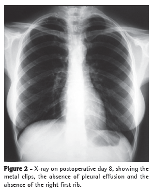 Chylothorax as a complication of the surgical treatment of thoracic outlet syndrome is an event rarely described in the literature.(6,7) In most reports, complications include vascular and nerve lesions, the nervous lesions being the most common,(3,4) especially in the supraclavicular approach. In a study of 770 consecutive cases of first rib resection by supraclavicular approach, there was only one case of chylothorax, which resolved spontaneously.(6) In another study, involving 668 surgical