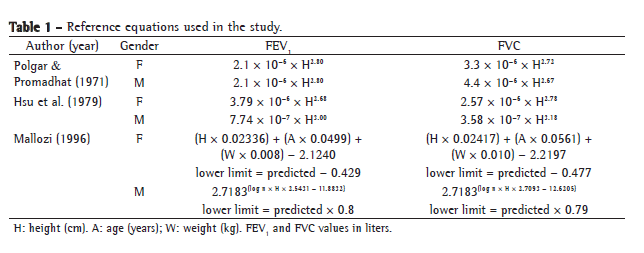 Therefore, the characteristics of the populations should be observed and monitored. When the Polgar & Promadhat(21) and Hsu et al.(22) equations are used in other countries, such as Brazil, in individuals who are different from those composing the original reference sample, this criterion is not met. Consequently, in order to choose a certain equation, the characteristics of the population should be considered so that this equation can represent the pulmonary function parameters more accurately.