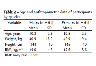 ResultsA total of 122 children and adolescents-61 males and 61 females (mean age, 10.26 ± 2.26 years and 10.54 ± 2.26 years, respectively)-were included in the study. The anthropometric characteristics of the sample as a whole are presented in Table 2. There were no differences between males and females in terms of anthropometric parameters.