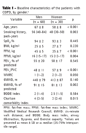 It is well known that COPD is a preventable and treatable disease, characterized by airflow limitation that is not fully reversible. In addition, it is well established that COPD is associated with systemic consequences that adversely interfere with the disease prognoses, including fat-free mass (FFM) depletion,(1) exercise ­intolerance,(2) and impairment of health status (HS).(3) Although recent surveillance studies on COPD have shown that the prevalence of COPD and hospitalizations due to the disease has increased in women,(4) there have been few reports comparing its impact and its systemic manifestations between genders.(5-10) Results from these studies have suggested that, among COPD patients, the perception of dyspnea, exercise intolerance and HS impairment are greater in females than in males.(5-10)