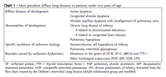 In order to better define ILDs in children, the work group decided to incorporate clinical data to the definition of the "chILD syndrome" to aid in recognizing these disorders. For the diagnosis of ILDs, it was established that, in the absence of known causes of lung disease, at least 3 of the following criteria had to be present: 1) respiratory symptoms (cough, rapid or difficult breathing, or exercise intolerance); 2) signs (tachypnea at rest, crackles, retractions, digital clubbing, underdevelopment or respiratory failure); 3) hypoxemia; and 4) diffuse alteration on chest X-rays or CT scans. By applying the definition of the chILD syndrome, 3 to 4 criteria were met by 91% of the 218 cases studied in 11 centers in North America (1999-2004).(2,15) The group reviewed the biopsy results of 187 children (1999-2004) and developed a new clinical and histological classification,(2) which principally organized the disorders in children under 2 years of age (Chart 1). This classification is probably not definitive. It should be pointed out that the duration should not be added to the definition because the disease progresses rapidly in some neonates. Some of the previous definitions, including that developed by the ERS work group, limited their scope to children presenting disease duration of 3 months.