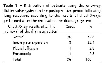 During the postoperative period, lung expansion, duration of drainage using the one-way flutter valve, hospital stay and postoperative complications were noted. The patients were submitted to chest X-rays in the immediate postoperative period, after the removal of the drainage system and during the 90-day, postoperative outpatient follow-up period.