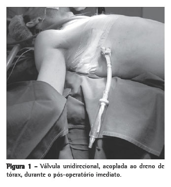 O objetivo deste estudo é analisar a válvula unidirecional de tórax (VUT), como método de drenagem pleural, no pós-operatório de ressecção pulmonar eletiva. Esta válvula é similar a de Heimlich e foi desenvolvida no serviço de cirurgia torácica da Santa Casa de Misericórdia de Ribeirão Preto, em 1988. Este serviço vem utilizando a VUT no tratamento ambulatorial do pneumotórax espontâneo.(9)