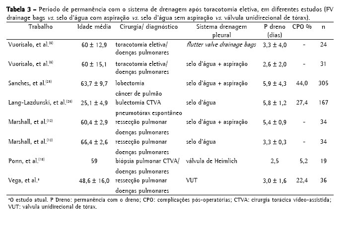 Na Tabela 3, foi relacionado o resultado deste trabalho com os sistemas de drenagens utilizados por outros autores,(6,12,25,26) no pós-operatório de ressecção pulmonar eletiva. Os dados desta tabela sugerem que a VUT apresentou período de permanência com o dreno de tórax semelhante ou inferior ao de outros estudos.