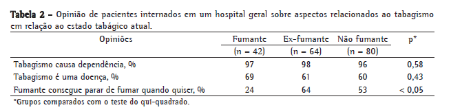 Os dados referentes ao conhecimento sobre o tabagismo estão apresentados na Tabela 2. A proporção de fumantes (56%) e ex-fumantes (65%) que não conheciam a associação do tabagismo e a causa de internação por doença relacionada ao tabaco foi similar (p = 0,50).