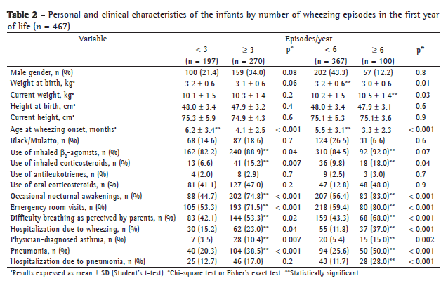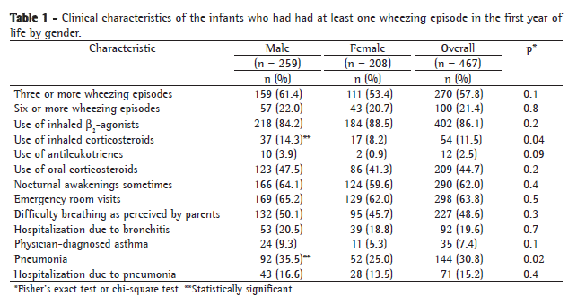 Among the wheezers, there was a predominance of male infants, who also had a higher frequency of pneumonia episodes and received inhaled corticosteroids for the treatment of wheezing more frequently than did female infants (Table 1). Studies have demonstrated that male gender is a risk factor for wheezing in children, and it has been suggested that the smaller airway diameter in boys at birth is an explanation for this.(1)