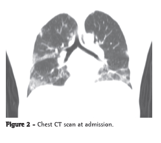 A chest X-ray showed worsening of the bilateral alveolar infiltrate, and a chest CT scan showed multifocal ground-glass infiltrate (Figures 1 and 2).