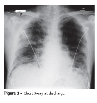 The patient was admitted to the ICU and treated with oseltamivir, ceftriaxone, azithromycin and a corticosteroid. He received ventilatory support with intermittent positive pressure breathing, which was maintained at 50% via a Venturi mask, at a resting SpO2 of 92%. The patient progressively improved and was discharged from the ICU ten days later, presenting an SpO2 of 94% on room air, together with radiological improvement (Figure 3). He developed no fever or hemodynamic instability during the hospital stay.
