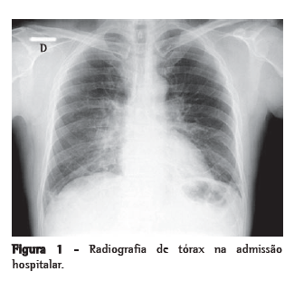 Apresentava pressão arterial, 130-90 mmHg; temperatura, 36,8°C; peso, 68 kg; altura, 1,65 m; IMC, 25,0 kg/m2; e FR, 30 ciclos/min. À ausculta pulmonar apresentava estertores crepitantes difusos em ambos os pulmões e bulhas rítmicas normofonéticas sem sopros. Abdome sem visceromegalias, extremidades sem edema, SpO2 = 87% em ar ambiente e SpO2 = 94% com máscara de oxigênio a 5 L/min.