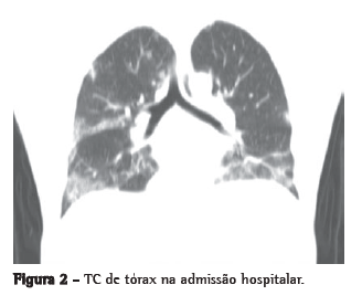 A radiografia de tórax mostrava piora do infiltrado alveolar bilateral e a TC de tórax mostrava infiltrado multifocal em vidro fosco (Figuras 1 e 2).
