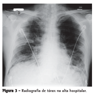 O paciente foi internado na UTI e medicado com oseltamivir, ceftriaxona, azitromicina e corticoide. Recebeu suporte ventilatório com respiração por pressão positiva intermitente, mantido com máscara de Venturi a 50% e SpO2 = 92% em repouso. Foi melhorando progressivamente, recebendo alta da UTI dez dias depois, com SpO2 = 94% em ar ambiente e melhora radiológica (Figura 3). Não apresentou febre nem instabilidade hemodinâmica durante a internação.