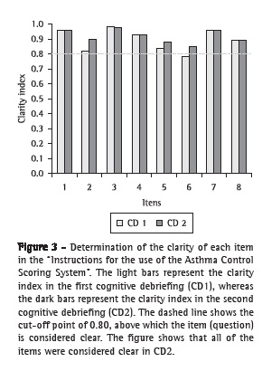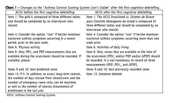 Despite being technically and semantically equivalent to the original instrument, the Brazilian Portuguese-language version of the ACSS corrected and clarified minor discrepancies in the instructions to the original document. For example, in the original version of the ACSS, the instructions for its use are presented in the "ACSS User's Guide" and also in the "Instructions for the use of the Asthma Control Scoring System", resulting in repetition of information and lack of clarity due to the fact that the terms are not standardized. In addition, item 15, which addresses absenteeism, was deleted, because, although the author of the original version agreed that this information is interesting, the item did not appear in the original version of the ACSS and had no impact on the determination of the asthma control score. Because of these small changes, despite the fact they are perceived as unnecessary if a careful method of cross-cultural adaptation has been used, we consider that further studies employing the Brazilian Portuguese-language version of the ACSS are required in order to confirm whether this version of the ACSS provides equally appropriate and valid measurements.