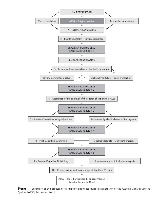 10) Reconciliation and preparation of the final version: The objective of this step was to create the final version of the adapted instrument for use in Brazil. All of the participants in the previous steps, except for the participants in the cognitive debriefing step, met to create the final version of the process of translation and cross-cultural adaptation of the ACSS (translated as Sistema de Escore para Controle Abrangente da Asma-Scoring System for the Comprehensive Control of Asthma) for use in Brazil. As an illustration, all of the steps of the cross-cultural adaptation are shown in Figure 1.