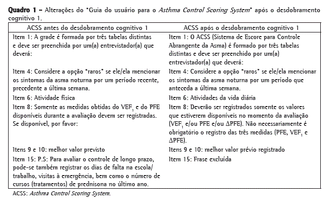 Embora a versão do ACSS na língua portuguesa falada no Brasil possua equivalência técnica e semântica em relação à do instrumento original, ela corrigiu e ordenou pequenas falhas de instrução contidas no documento original. Por exemplo, no ACSS original, as instruções sobre a sua utilização estão apresentadas tanto no "Guia do usuário para o ACSS" como nas "Instruções para a utilização do Sistema de Escore de Controle da Asma", gerando repetição de informações e falta de clareza pela não padronização de termos. Adicionalmente, o item 15, que trata de absenteísmo, foi excluído, pois o autor do original concordou que esse dado, embora interessante, não aparecia na versão original do ACSS e não apresentava nenhum impacto no cálculo do escore de controle da asma. Por causa dessas pequenas alterações, embora percebidas como desnecessárias se o método de adaptação cultural tiver sido rigoroso, consideramos que estudos posteriores utilizando a versão do ACSS para uso no Brasil serão relevantes para confirmar que esta versão do ACSS fornece medidas igualmente apropriadas e válidas.