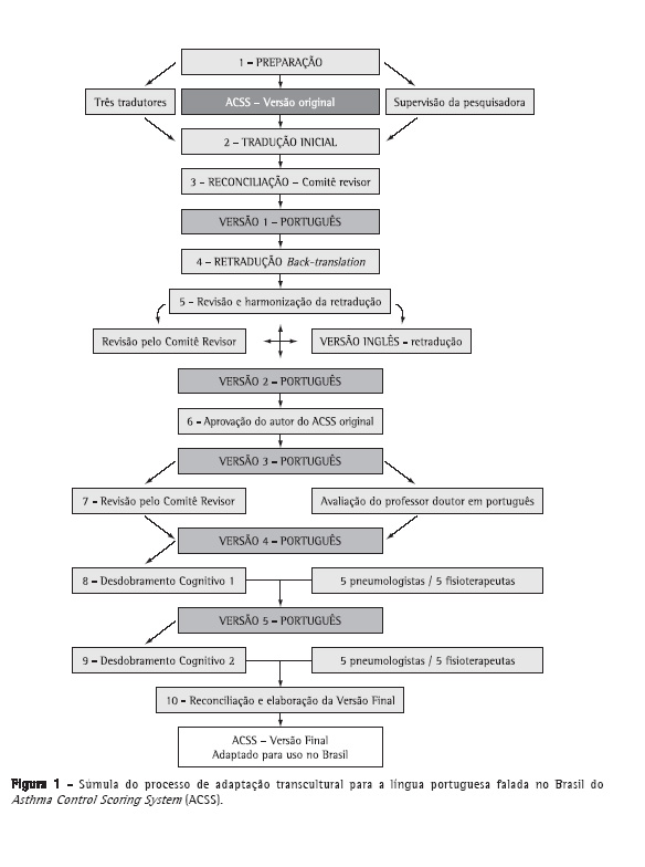Objetivo: Traduzir e adaptar culturalmente, para uso no Brasil, um instrumento específico de escore para o controle abrangente da asma, denominado Asthma Control Scoring System (ACSS). Métodos: O protocolo incluiu dez etapas: autorização escrita do autor do ACSS; tradução do instrumento para a língua portuguesa do Brasil por três tradutores; análise e comparação das três versões por um comitê revisor; retradução literal para o inglês; revisão e harmonização da retradução; aprovação do autor do ACSS; revisão da tradução por especialistas; desdobramento cognitivo: teste da clareza, compreensão e aceitabilidade junto à população alvo (avaliação da tradução por 10 profissionais da área da saúde); segundo desdobramento cognitivo: revisão da nova versão por um segundo grupo de profissionais da área de saúde; e reconciliação e elaboração da versão final pelo comitê revisor. Resultados: A versão do ACSS em português do Brasil apresentou clareza, compreensão e aceitabilidade. O instrumento foi considerado abrangente por englobar as manifestações clínicas, funcionais e inflamatórias da asma. Conclusões: Com o uso desta metodologia criteriosa empregada para a adaptação transcultural do ACSS, asseguramos sua adequação cultural para uso no Brasil. O uso desse instrumento poderá facilitar futuros estudos sobre o controle da asma.