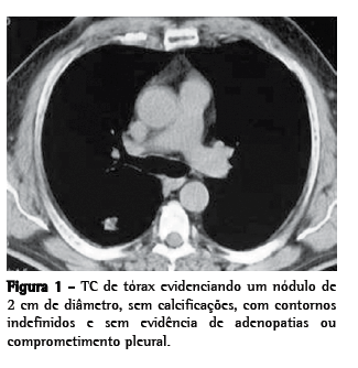 Estava assintomático até março de 2008, altura em que, por motivo de rotina, realizou radiografia do tórax, evidenciando hipodensidade compatível com nódulo pulmonar localizado ao lobo inferior direito, o qual foi posteriormente confirmado por TC em abril do mesmo ano (Figura 1). O nódulo apresentava 2 cm de diâmetro, sem calcificações, com contornos indefinidos e sem evidência de adenopatias ou comprometimento pleural.